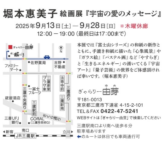 本展では『富士山シリーズ』の和紙の新作とともに、手漉き和紙に描いた『心象風景』や『ガラス絵』『パステル画』など「やすらぎ」と「生きるエネルギー」の湧いてくる『宇宙アート』『量子芸術』の世界をご体感頂ければ幸いです。